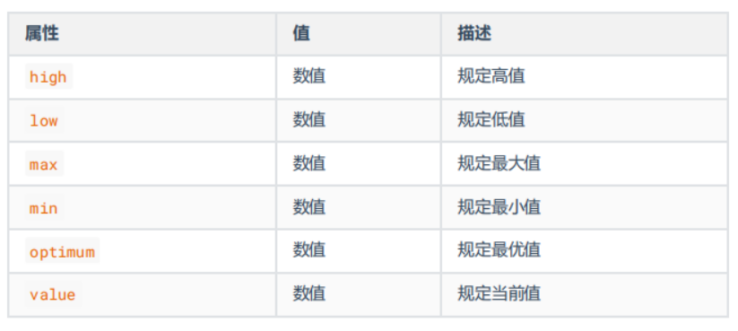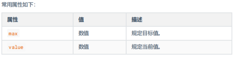 语义:显示某个任务完成的进度的指示器,一般用于表示进度条,双标签,例如:工作完成进度