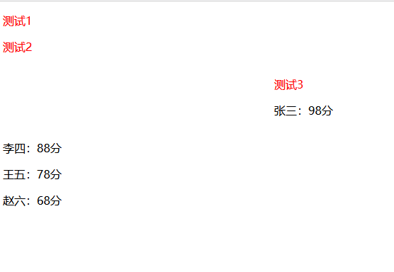 <p>测试1</p> <div> <p>测试2</p> <marquee> <p>测试3</p> <p>张三:98分</p> </marquee> <p>李四:88分</p> <p>王五:78分</p> <p>赵六:68分</p> </div> </body> </html>