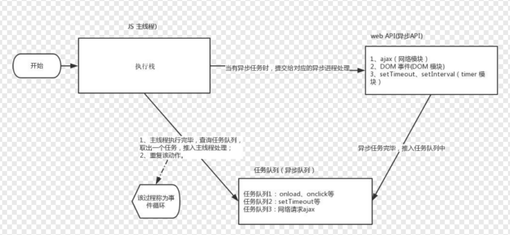 - 一旦执行栈中的所有同步任务执行完毕,系统就会按次序读取任务队列中的异步任务,于是被读取的异步任务结束等待状态,进入执行栈,开始执行。