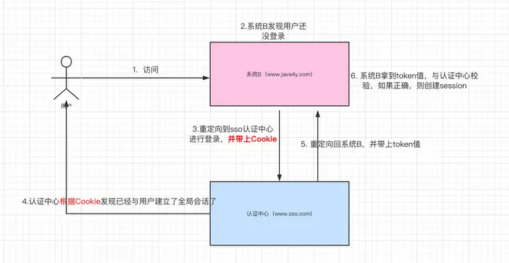 注意,因为之前用户与认证中心www.sso.com已经建立了全局会话(当时已经把Cookie保存到浏览器上了),所以这次系统B重定向到认证中心www.sso.com是可以带上Cookie的。