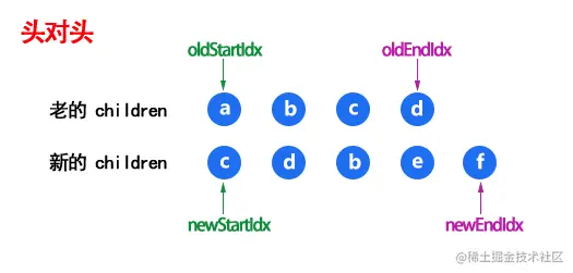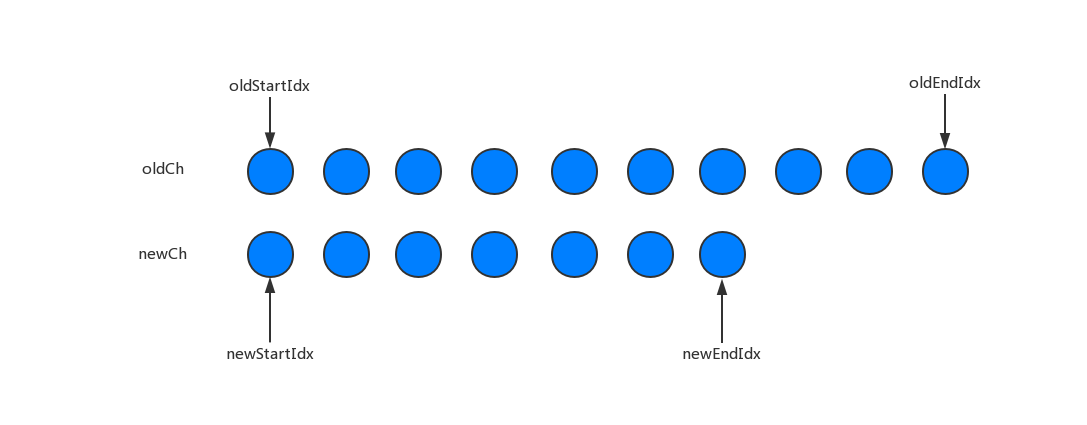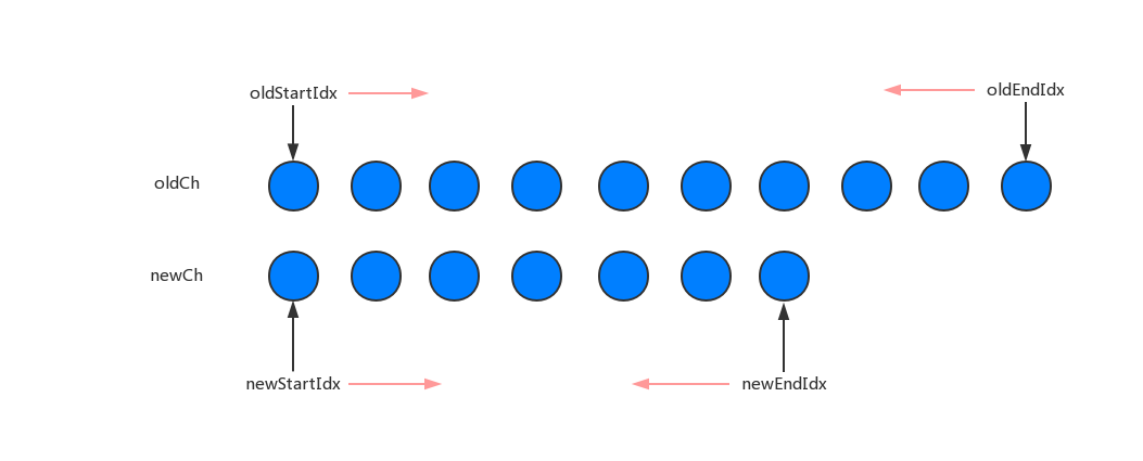 首先我们定义 oldStartIdx、newStartIdx、oldEndIdx 以及 newEndIdx 分别是新老两个 VNode 的两边的索引,同时oldStartVnode、newStartVnode、oldEndVnode 以及 newEndVnode 分别指向这几个索引对应的 VNode 节点。