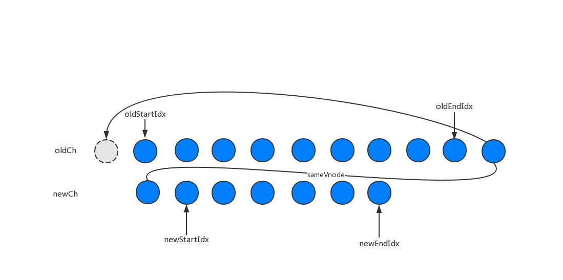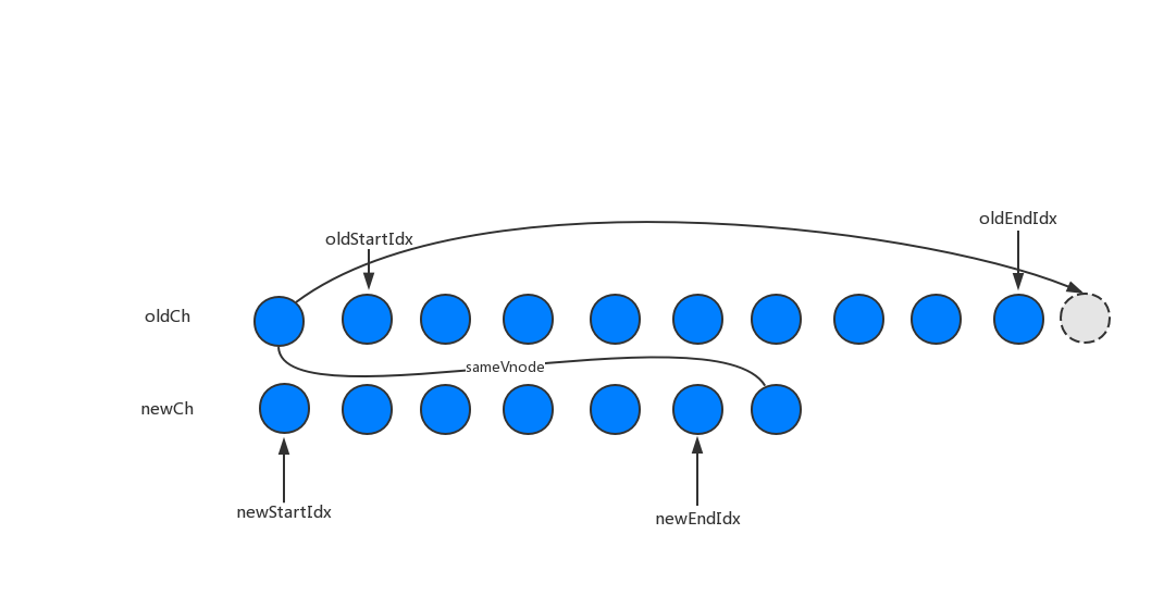 oldStartVnode、newEndVnode,若两者符合sameVnode,也就是老oldVnode节点的头部与新vNode节点的尾部是同一节点的时候,将oldStartVnode.elm这个节点直接移动到oldEndVnode.elm这个节点的后面即可。然后oldStartIdx向后移动一位,newEndIdx向前移动一位。