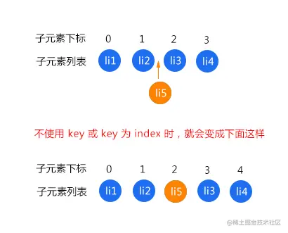 如图的 li1 和 li2 不会重新渲染,这个没有争议的。而 li3、li4、li5 都会重新渲染