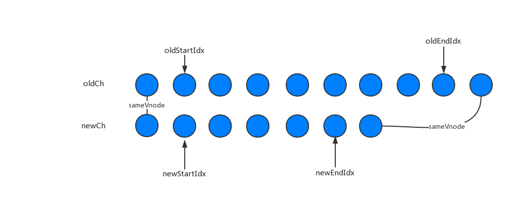 oldEndVnode、newEndVnode同理,若两者符合sameVnode,直接进行patchVnode,同时oldEndIdx与newEndIdx向前移动一位。