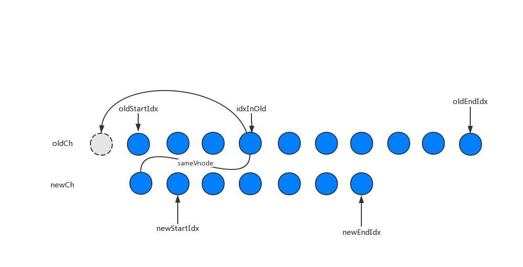 idxInOld,且符合sameVnode,则执行patchVnode并将oldCh[idxInOld] = undefined,最后将newStartIdx向后移动一位。