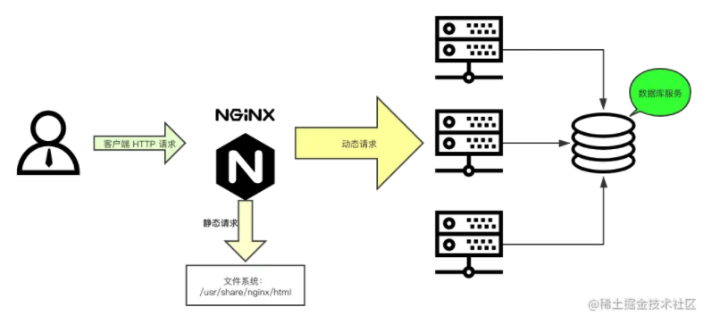一般来说,都需要将动态资源和静态资源分开,由于 Nginx 的高并发和静态资源缓存等特性,经常将静态资源部署在 Nginx 上。如果请求的是静态资源,直接到静态资源目录获取资源,如果是动态资源的请求,则利用反向代理的原理,把请求转发给对应后台应用去处理,从而实现动静分离。